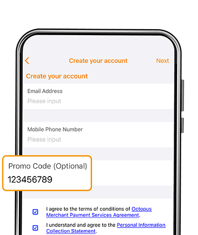 Download Octopus App for Business, enter the referrer’s Business Account no. (exclude the bracketed no.) in the “Promo Code” field during application