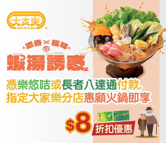 凭乐悠咭或长者八达通付款,于指定大家乐分店惠顾火锅,即可享$8折扣优惠。