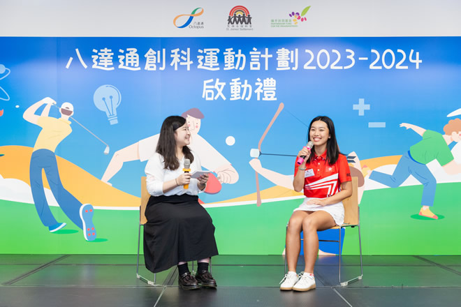 - 现役香港高尔夫球代表队队员甄晓攸小姐(右)在启动礼上分享其运动员生涯的难忘经历及对运动科学的见解。