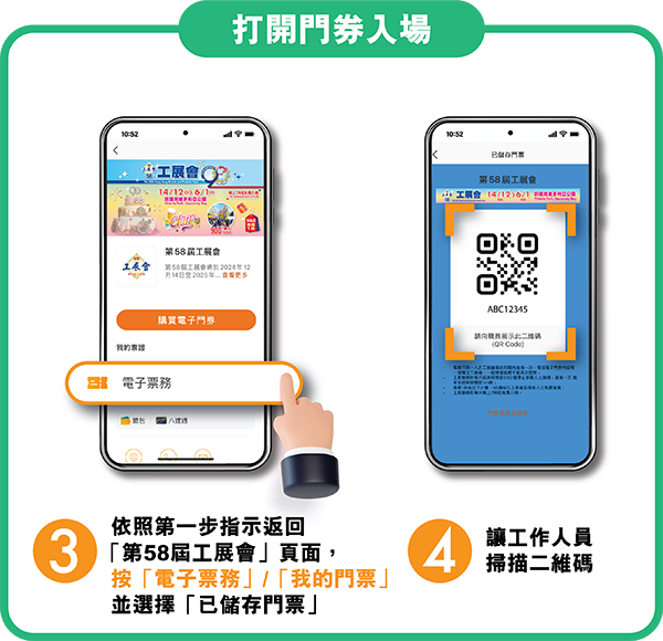 - 依照第一步指示返回「第58届工展会」页面,按「电子票务」并选择「已储存门票」