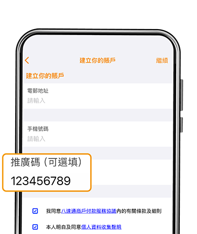 下載商用版八達通App開戶,並於「推廣碼」一欄輸入推薦人的商用賬戶號碼 (不包括括號內數字)