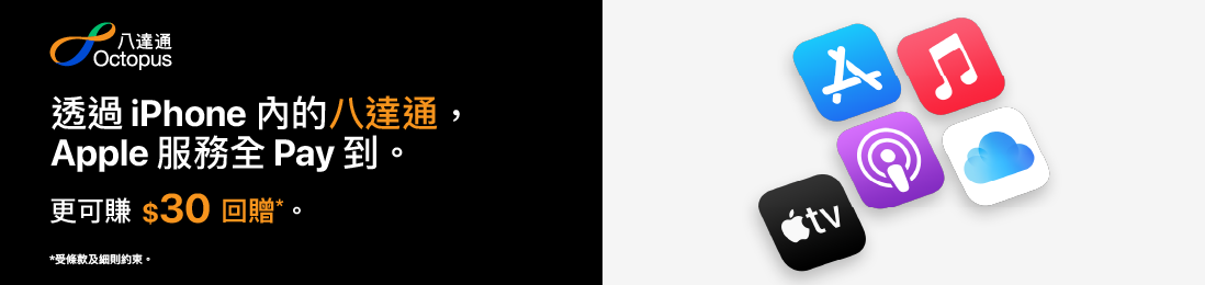 由即日起至2025年12月31日,加八達通入你的 Apple 帳戶,預設為付款方式,並使用已設定的八達通在 iPhone 支付$10或以上的購物單一帳單消費,可獲$30八達通增值額。