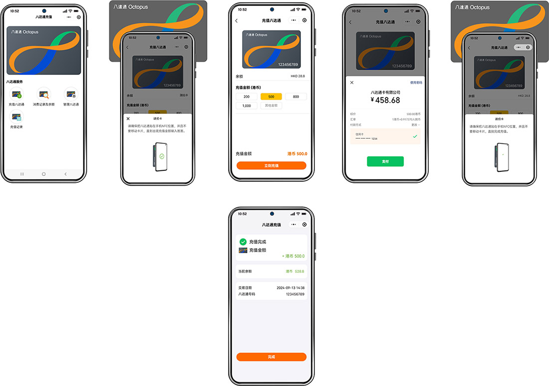 「八達通充值 Octopus Reloading」將為旅客提供充值、查閱餘額及交易紀錄、查閱充值紀錄三大功能。如旅客須查閱交易紀錄,可先在有關小程序登記八達通。