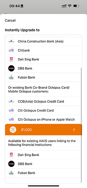 If you are an existing AAVS user linking to the following financial institutions, you can now upgrade your auto-reload amount to $1,000 instantly via the Octopus App*.
