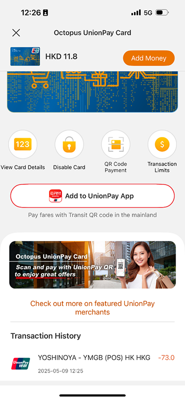 The transaction history of your UnionPay Card will be shown in the “Octopus UnionPay Card” page.