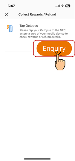 - 3. Tap “Enquiry” and tap your JoyYou Card to the NFC area of your mobile device to check the rewards details. Tap “Collect” if there is a pending cash rebate to be collected