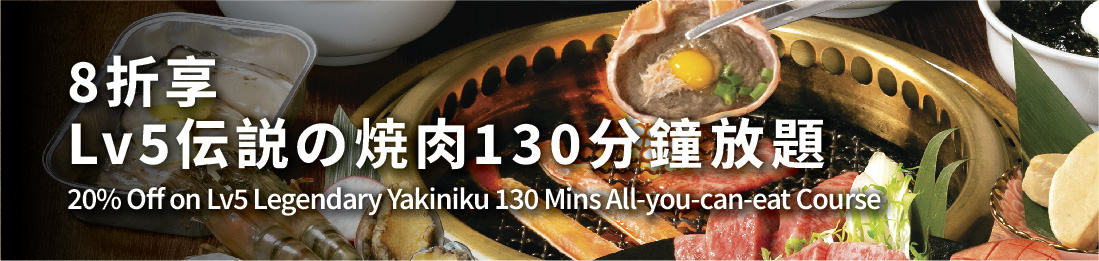 - Enjoy Lv5 Legendary Yakiniku 130 Mins All-you-can-eat Course at 20% off from regular price with this e-coupon.