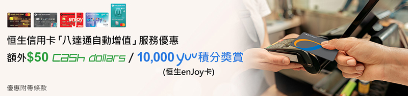 由即日至12月31日,客戶憑恒生信用卡主卡成功申請自動增值服務及於2021年1月31日完成一次自動增值,可享額外$50 Cash Dollars或恒生enJoy卡 10,000yuu 積分獎賞。