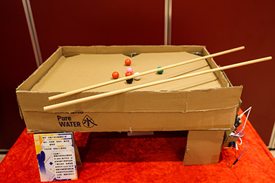 Snooker group: Using a Micro:bit (microcomputer) connected with ultrasonic and colour sensors to program an automatic scoring system. Environmentally-friendly materials, such as cardboard, were also used to create a low-cost solution that enables athletes to train independently. |