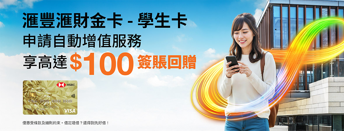 - 汇丰汇财金卡- 学生卡迎新优惠受条款及细则约束,详情请按此。