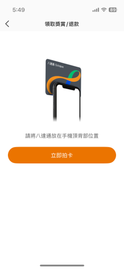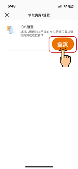 - 3. 点选 「查询」并将乐悠咭拍向手机NFC位置。当有现金回赠可供领取时,点选 「领取」