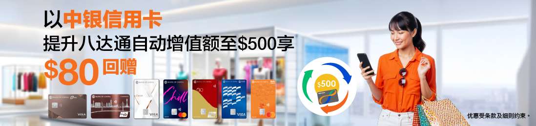 以中银信用卡提升自动充值额至$500可赚$80回赠!