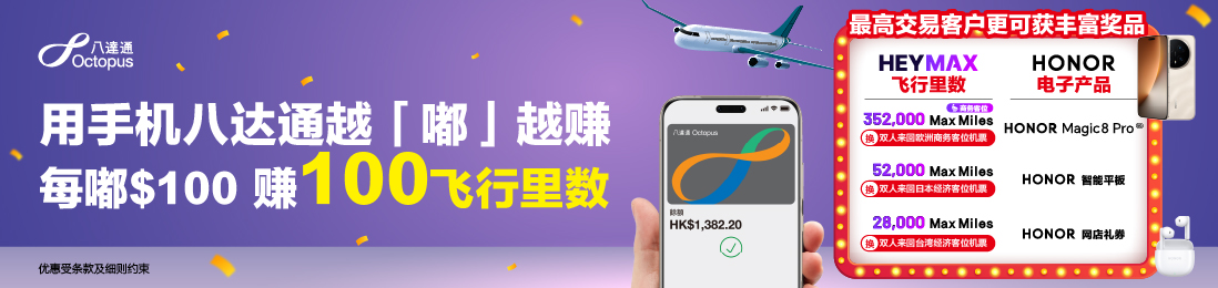 由2025年12月8日至2026年1月7日(推广期),客户用已登记的手机八达通单一消费满$100,即可赚取100 Max Miles!于推广期间消费次数最高的客户更可获得丰富奖赏,包括HeyMax飞行里数及HONOR电子产品!