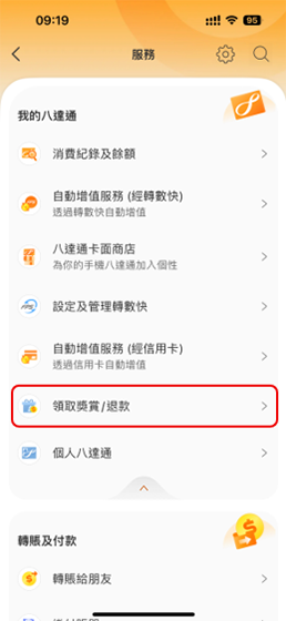 - 于「我的八达通」点选「领取奖赏/退款」。