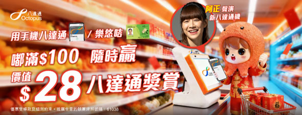 用手机八达通/乐悠咭「嘟」满100元 即有机会赢取价值高达28元奖赏