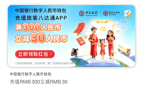 (香港,2026年2月13日) 八达通卡有限公司(八达通)今日宣布,与中国银行联手推出全新数字人民币推广活动,旨在进一步提升内地旅客在港的电子支付体验。由即日起至3月15日,旅客只需透过旅客八达通App(iOS版),选用中国银行数字人民币(e-CNY)钱包为八达通充值,即可享独家立减优惠。