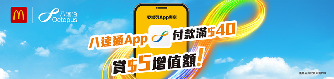 由即日起至 2026 年3 月15 日,八達通 App 用戶透過 麥當勞 App 點餐滿 $40 或以上,並以八達通或八達通銀包完成單次網上付款交易,可賺 $5 獎賞!每位八達通或八達通銀包用戶最多可享優惠 3次,推廣期內合共可獲高達 $15獎賞!