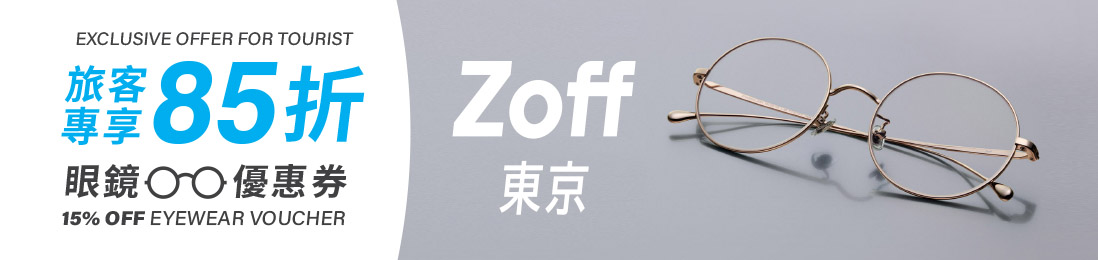 旅客於Zoff香港門市出示優惠碼和有效旅遊證件,購買正價眼鏡即享全單85折優惠。