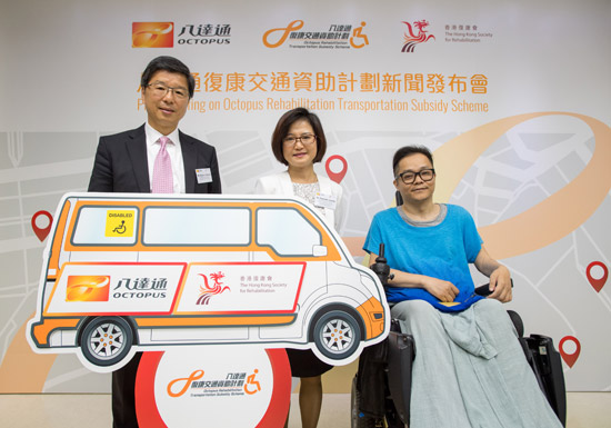 - 八達通卡有限公司與香港復康會宣布延續「八達通復康交通資助計劃」至2018年12月31日,為合資格的綜合社會保障援助輪椅使用者提供點對點無障礙交通服務。出席嘉賓包括八達通卡有限公司行政總裁張耀堂先生(左)、香港復康會總裁梁佩如博士(中)及計劃使用者許先生(右)。