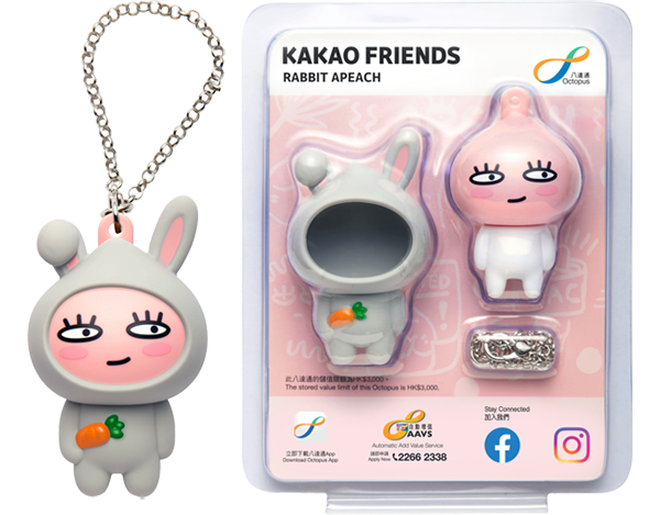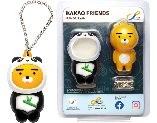 兩款全新成人版「KAKAO FRIENDS 3D八達通配飾」以動物為主題,Ryan化身成可愛熊貓,手執竹葉,展現天真善良的一面。而Apeach則穿上兔子裝束,拿著肥肥紅蘿蔔,表情調皮鬼馬,盡顯兔子淘氣的性格。每款KAKAO FRIENDS的動物服裝更可自由穿配,隨時隨地變身招牌角色或動物造型,添加樂趣。「KAKAO FRIENDS 3D八達通配飾」亦配有金屬扣,方便扣在袋上隨時使用。