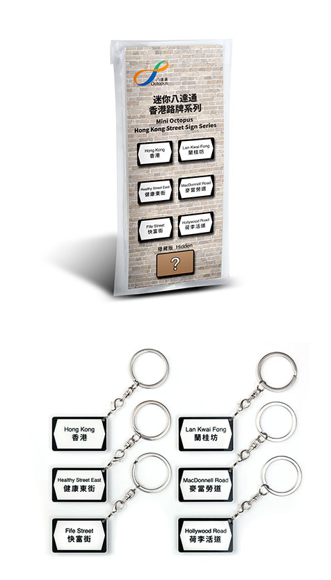 「迷你八達通 - 香港路牌系列」共推出七款設計,完美重現香港路牌的經典黑白字體與橫向排版,包括「香港」、「蘭桂坊」、「健康東街」、「麥當勞道」、「快富街」及「荷李活道」,當中更設有一款特別隱藏版讓客戶發掘,為收藏增添驚喜。